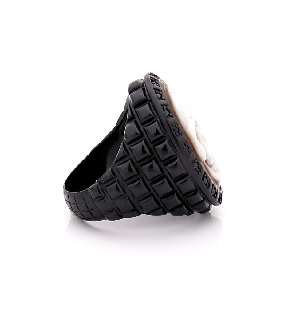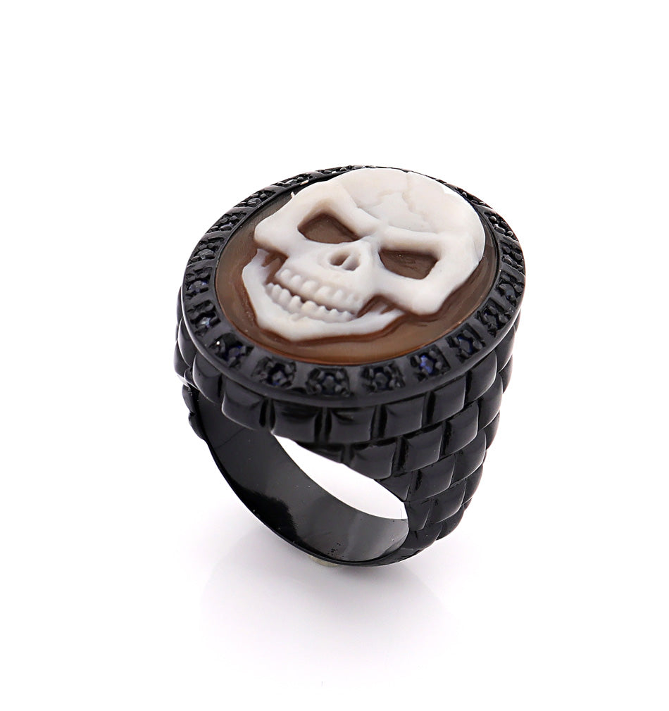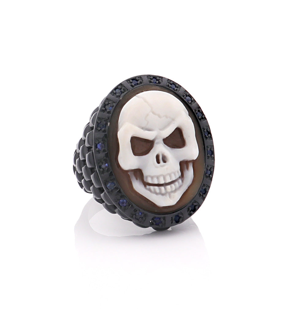 Questo cammeo in conchiglia di sardonica da 25 mm, intagliato a mano, trasforma un teschio in un audace emblema di presenza e individualità. Incastonato in argento sterling e impreziosito da zaffiri blu, il pezzo coniuga sapientemente la straordinaria maestria artigianale con una raffinata eleganza. Il teschio diventa un simbolo di forza, resilienza e stile senza tempo, rendendo l'anello più di un semplice gioiello: è una dichiarazione di carattere, sicurezza e raffinata raffinatezza.