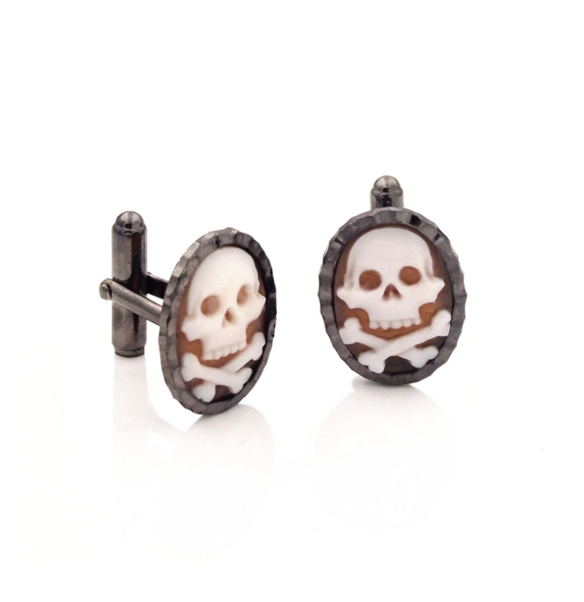 Questi orecchini con cammeo in conchiglia sardonica da 18 mm, intagliati a mano, presentano suggestivi motivi a teschio, incastonati in argento sterling con placcatura in rodio nero. Audaci e raffinati, trasformano un classico simbolo di mortalità in una dichiarazione di individualità e stile audace. Perfetti per aggiungere un tocco di grinta e raffinatezza a qualsiasi look, questi orecchini sono più di un semplice gioiello: sono un emblema di carattere, personalità ed eleganza senza tempo.