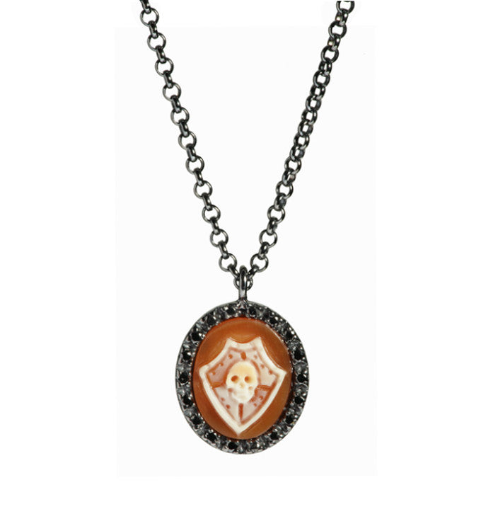Intitolato "SKULL SHIELD" , questo anello con cammeo in corniola da 12 mm intagliato a mano presenta un teschio trasformato in un audace emblema di protezione e forza. Incastonato in argento sterling con placcatura in rodio nero e impreziosito da diamanti neri, il pezzo combina una meticolosa lavorazione artigianale con dettagli sorprendenti. Compatto ma potente, incarna resilienza, individualità e stile audace, rendendo l'anello più di un semplice gioiello: è una dichiarazione di carattere ed eleganza audace.