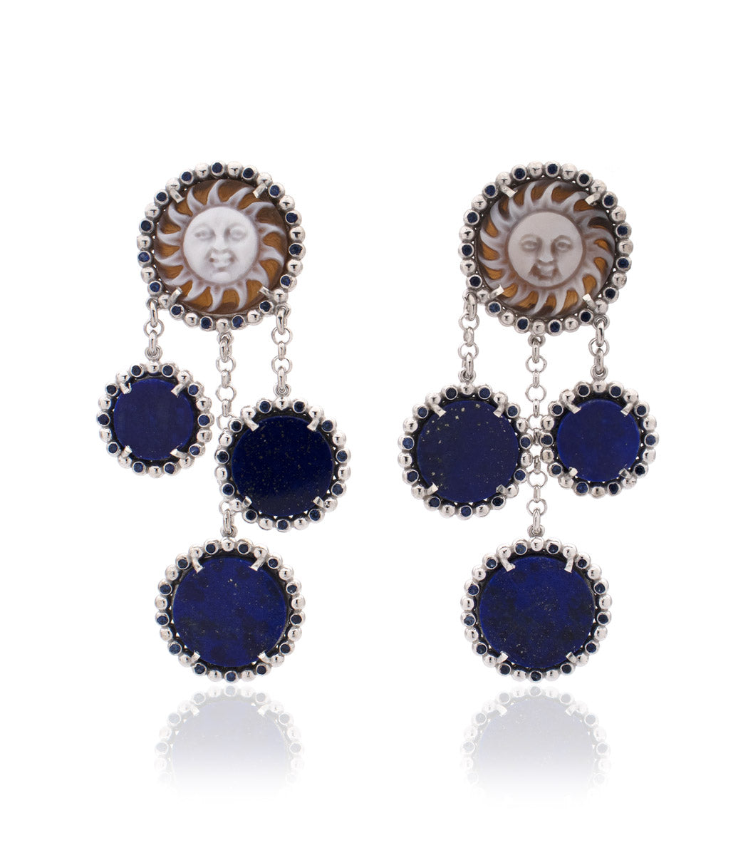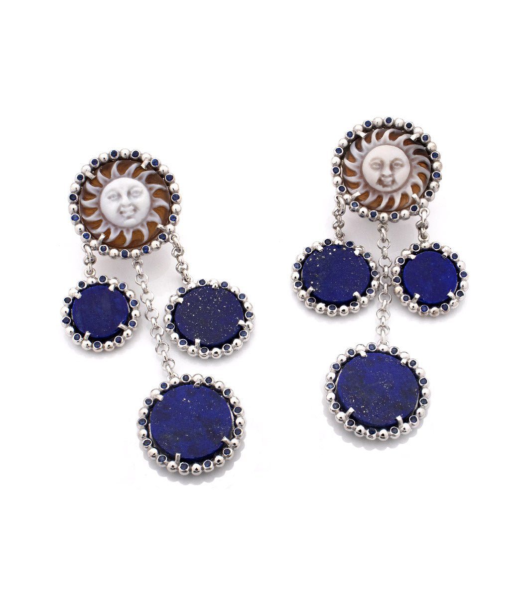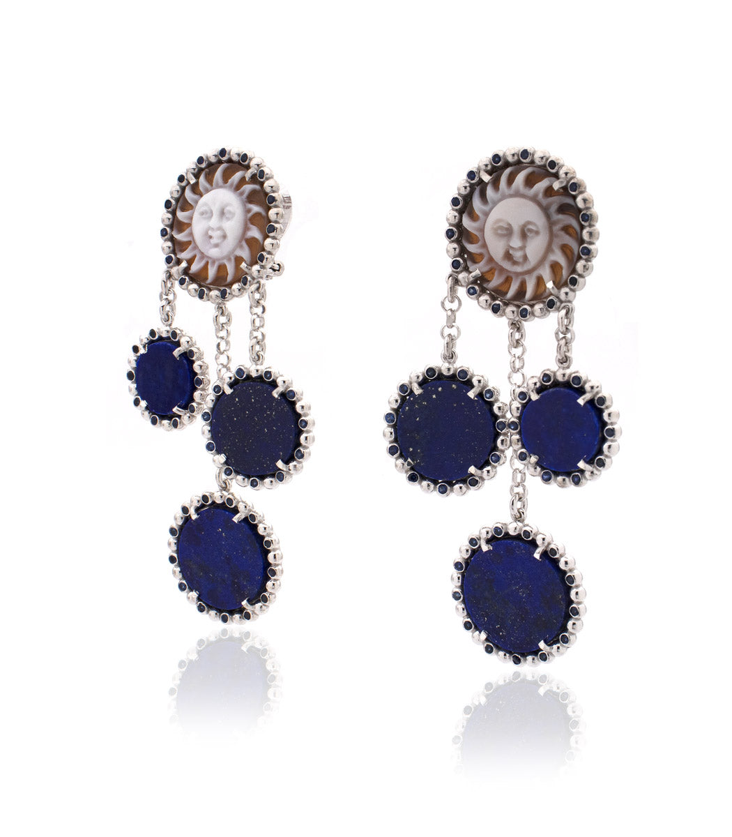 Questi orecchini pendenti presentano un design sofisticato che richiama elementi celesti. Nella parte superiore di ogni orecchino è presente un cammeo con l'immagine di un sole con i suoi raggi, circondato da piccoli zaffiri blu che aggiungono un tocco di brillantezza. Nella parte inferiore troviamo catene d'argento che collegano tre pietre di Lapislazzuli di varie dimensioni, circondate da zaffiri blu. L'abbinamento di colori e la disposizione dei materiali danno vita a un accessorio che evoca l'immagine di un cielo azzurro brillante.