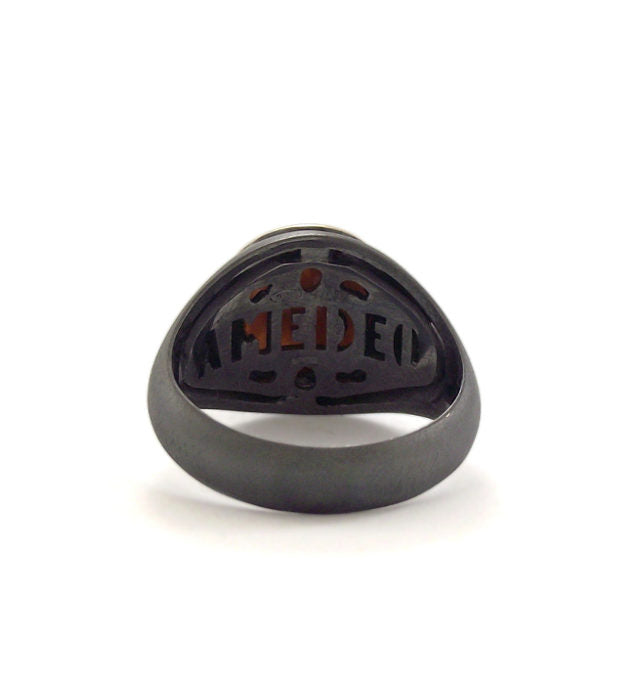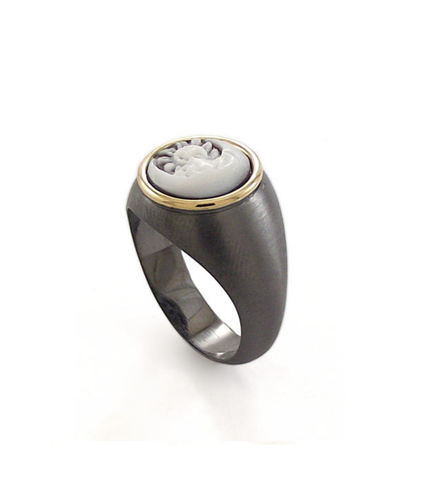 Cameo: cammeo in conchiglia sardonica da 10 mm intagliato a manoMetallo: oro 18kt e argento sterling rodiato nero