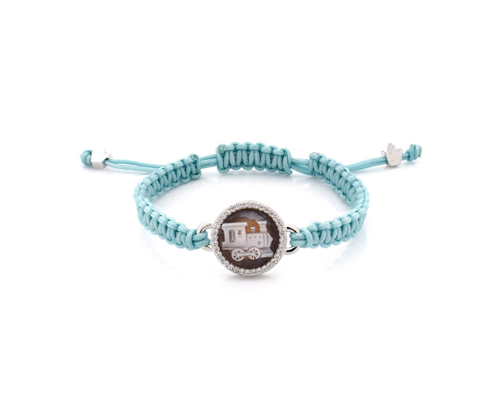 Tutti a bordo del Treno delle Meraviglie! Questo braccialetto azzurro presenta un cammeo intagliato a mano raffigurante un grazioso trenino, pronto a trasportare la fantasia in lungo e in largo. Montato su un cordino intrecciato, è il regalo perfetto per cuori avventurosi e menti curiose.