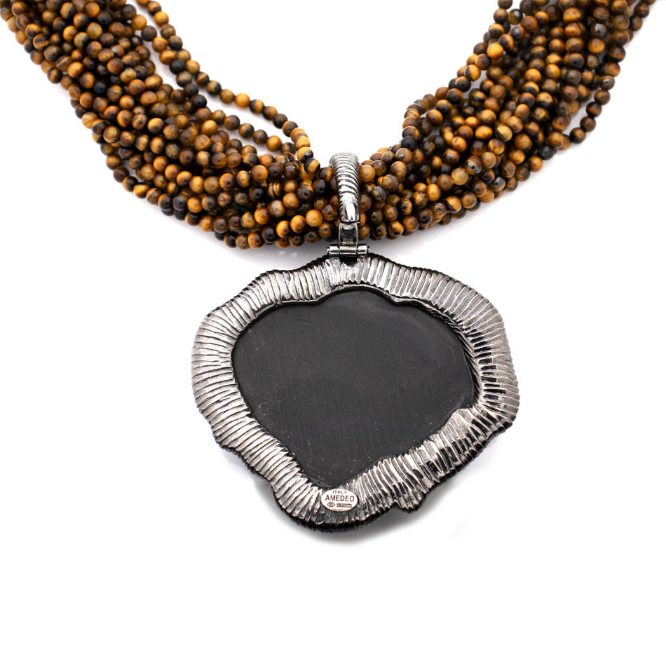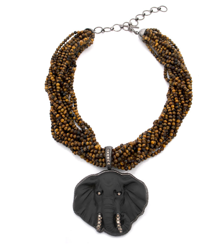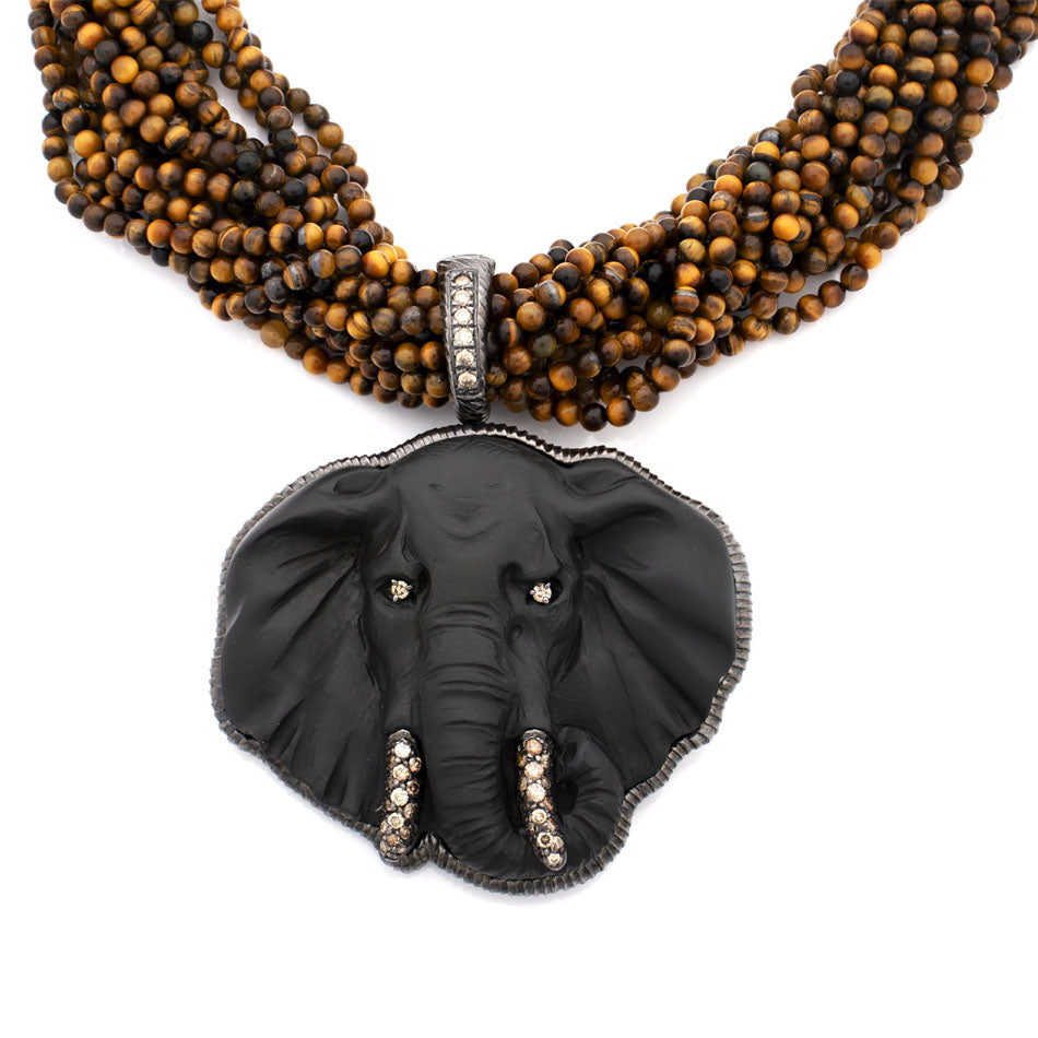 Hand-carved lava cameo depicting an elephant — timeless symbol of strength, wisdom, and protection. Its tusks, adorned with brown diamonds, radiate grounded elegance, while strands of tiger’s eye beads channel the earth’s warm energy. A tribute to nature’s enduring power and quiet majesty.