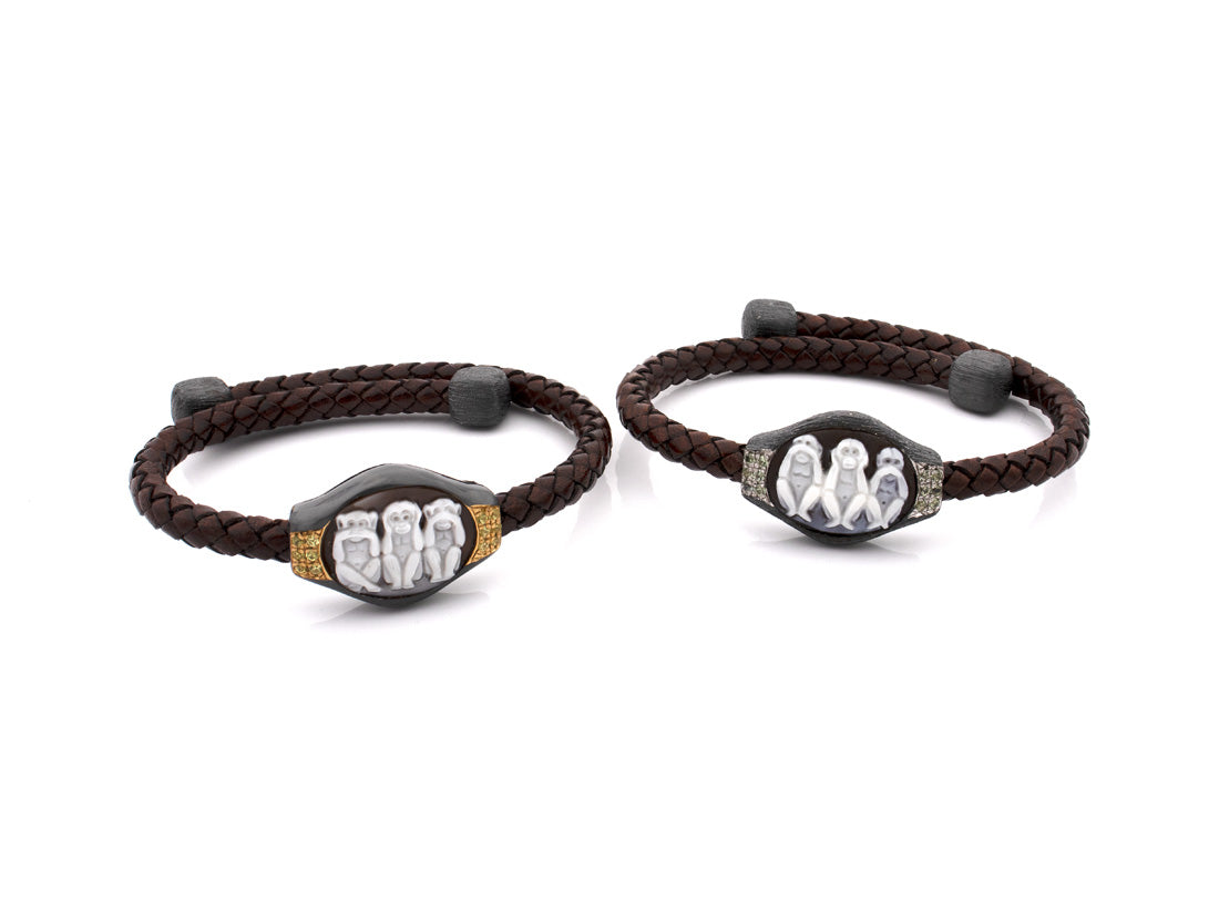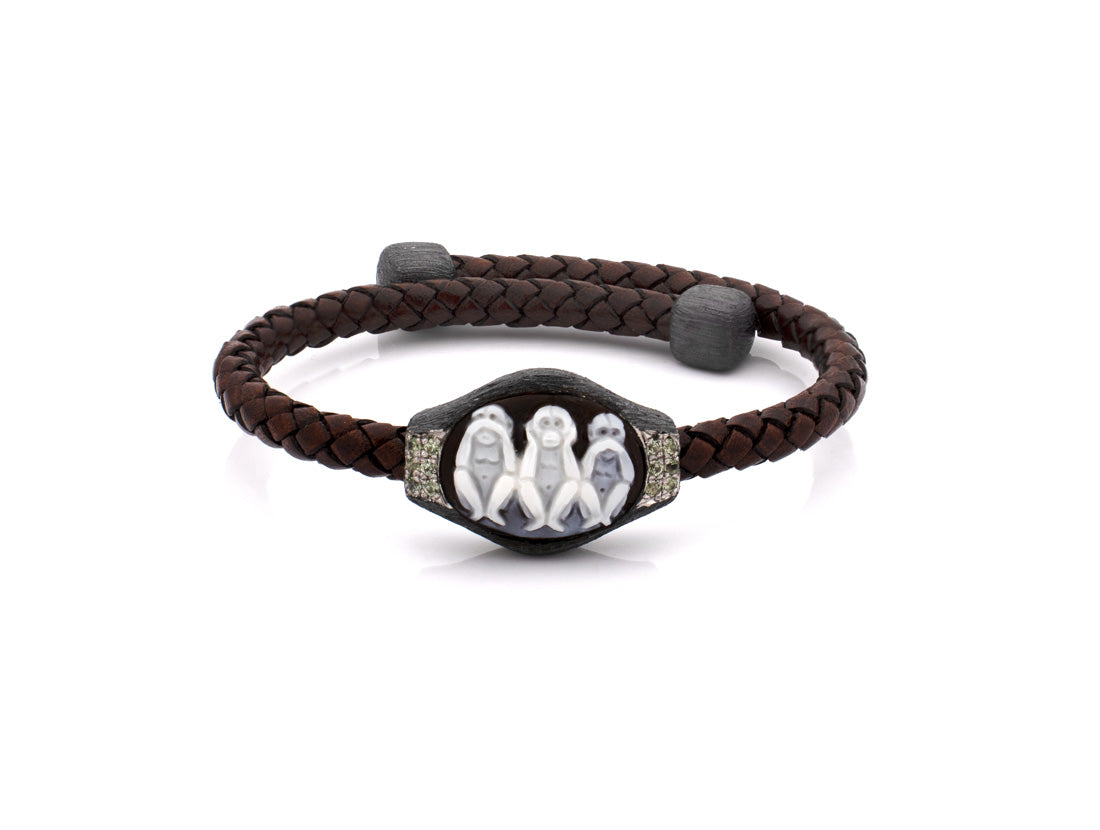 Questo eccezionale pezzo raffigura le "Tre Scimmie Sagge", l'intramontabile proverbio giapponese: non vedere il male, non sentire il male, non parlare del male. Il cammeo è una testimonianza di maestria artigianale, con ogni scimmia finemente scolpita nei minimi dettagli, incarnando saggezza, consapevolezza ed equilibrio.