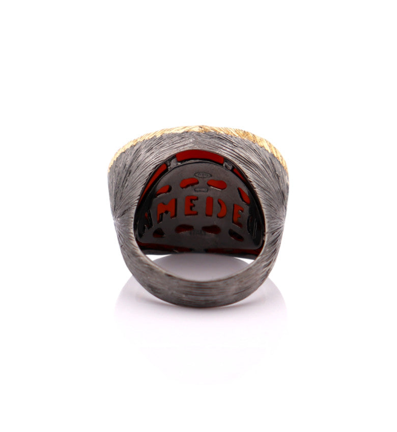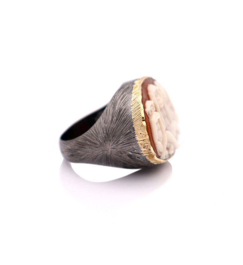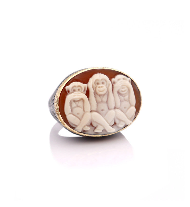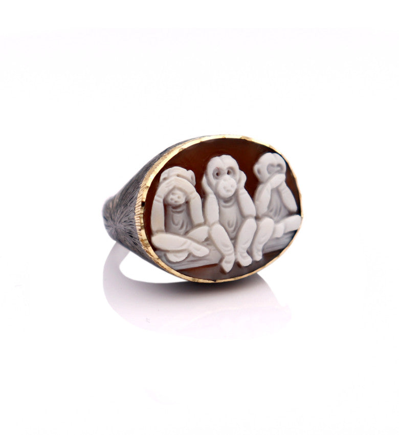 Questo anello unico raffigura le "Tre Scimmie Sagge", una classica rappresentazione dell'antico proverbio giapponese: "Non vedere il male, non sentire il male, non parlare del male". L'incisione del cammeo è frutto di una maestria artigianale eccezionale, con tre scimmie in rilievo dettagliato, ognuna delle quali incarna una delle massime. Il pezzo fonde elegantemente tradizione e modernità: il cammeo è incastonato in una lunetta in oro, creando un magnifico contrasto con la fascia in argento ossidato, dalla finitura testurizzata a raggiera.