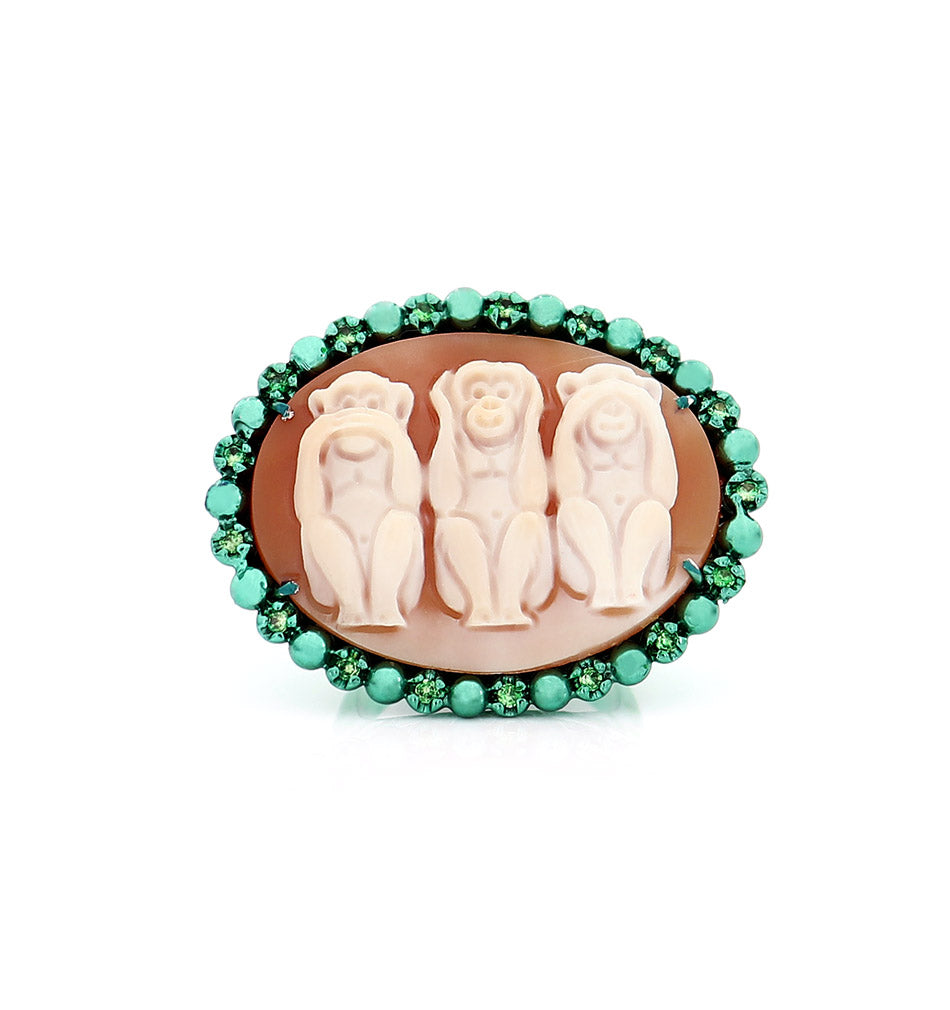Questo eccezionale pezzo raffigura le "Tre Scimmie Sagge", l'intramontabile proverbio giapponese: non vedere il male, non sentire il male, non parlare del male. Il cammeo è una testimonianza di maestria artigianale, con ogni scimmia finemente scolpita nei minimi dettagli, incarnando saggezza, consapevolezza ed equilibrio.