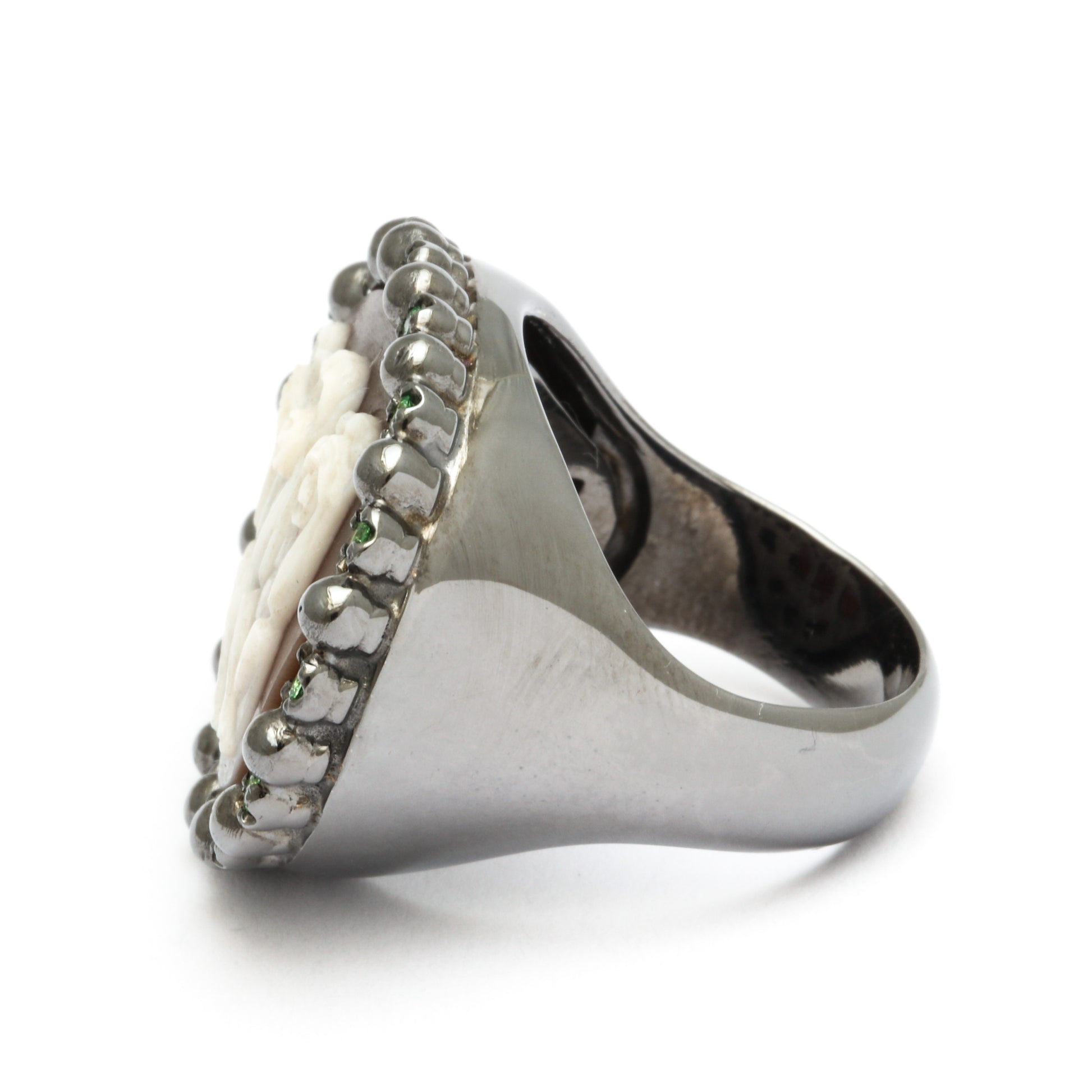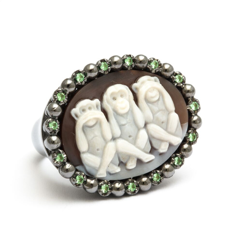 Questo eccezionale pezzo raffigura le "Tre Scimmie Sagge", l'intramontabile proverbio giapponese: non vedere il male, non sentire il male, non parlare del male. Il cammeo è una testimonianza di maestria artigianale, con ogni scimmia finemente scolpita nei minimi dettagli, incarnando saggezza, consapevolezza ed equilibrio.