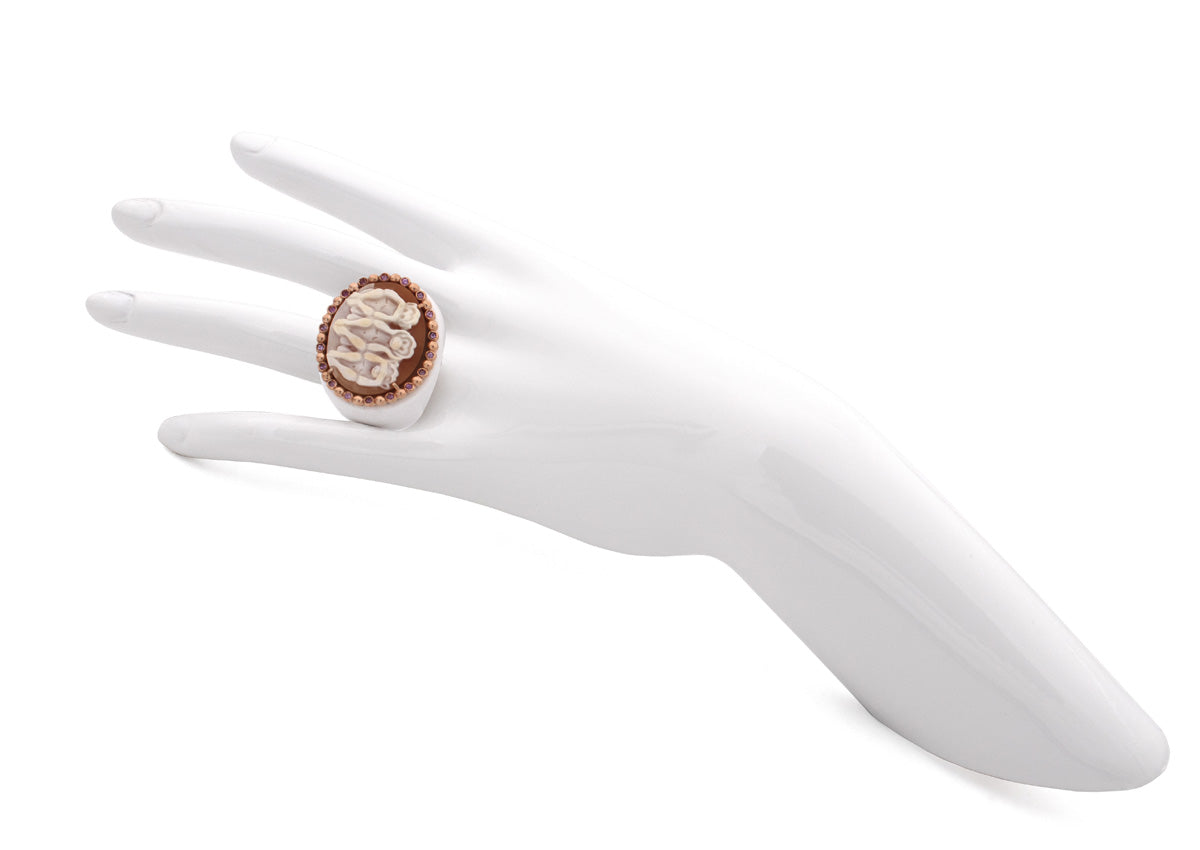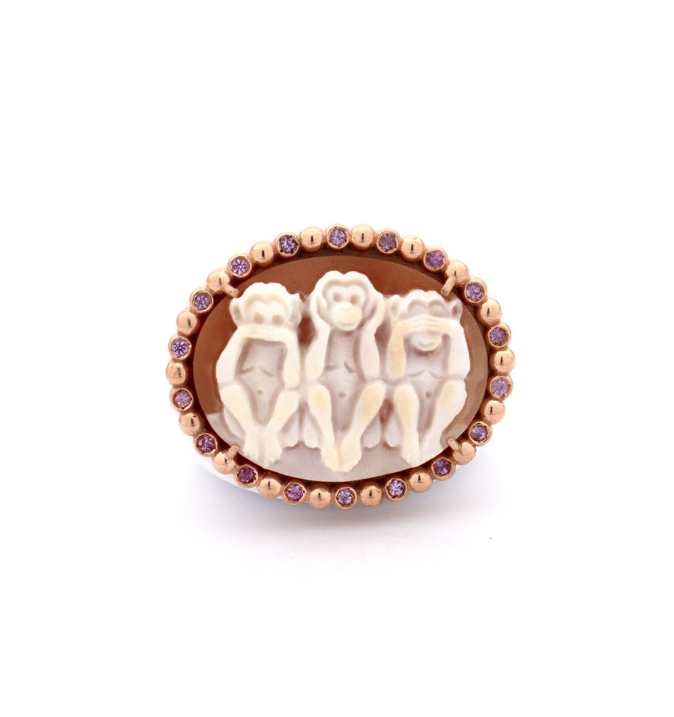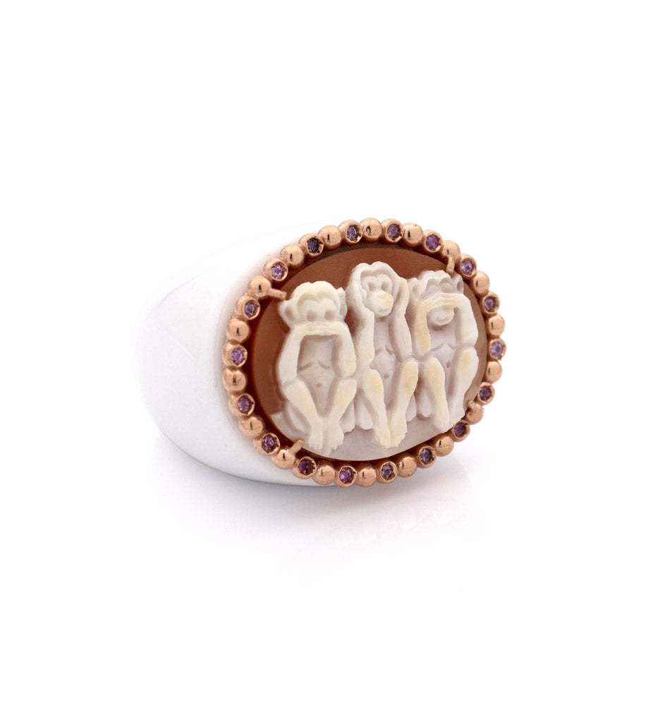 Questo eccezionale pezzo raffigura le "Tre Scimmie Sagge", l'intramontabile proverbio giapponese: non vedere il male, non sentire il male, non parlare del male. Il cammeo è una testimonianza di maestria artigianale, con ogni scimmia finemente scolpita nei minimi dettagli, incarnando saggezza, consapevolezza ed equilibrio.