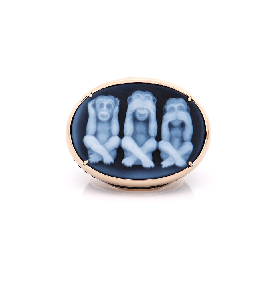 Questo eccezionale pezzo raffigura le "Tre Scimmie Sagge", l'intramontabile proverbio giapponese: non vedere il male, non sentire il male, non parlare del male. Il cammeo è una testimonianza di maestria artigianale, con ogni scimmia finemente scolpita nei minimi dettagli, incarnando saggezza, consapevolezza ed equilibrio.
