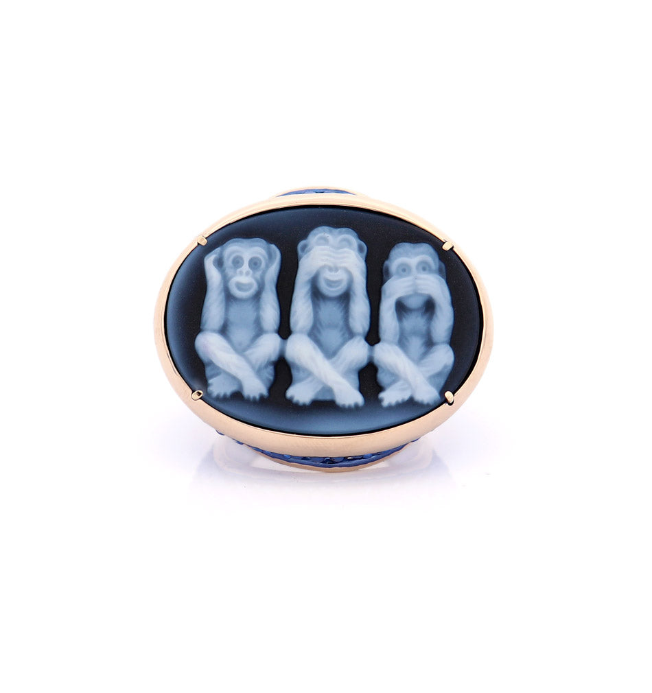 Questo eccezionale pezzo raffigura le "Tre Scimmie Sagge", l'intramontabile proverbio giapponese: non vedere il male, non sentire il male, non parlare del male. Il cammeo è una testimonianza di maestria artigianale, con ogni scimmia finemente scolpita nei minimi dettagli, incarnando saggezza, consapevolezza ed equilibrio.