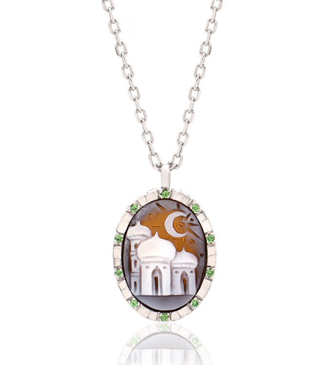 In the stillness of the night, when the world quiets and hearts turn inward, there is a sacred moment, a haven of night prayer. This necklace is a tribute to that serene time during Ramadan when the moon rises above the mosque, and souls connect deeply with the Divine.