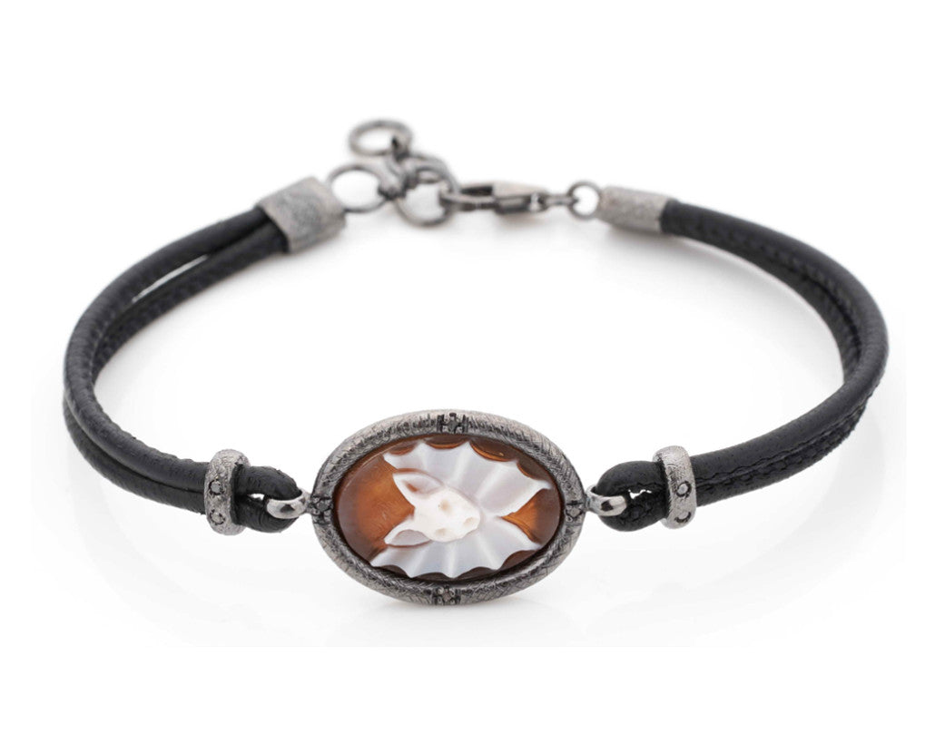 The Bat Cameo Bracelet stands as a testament to both gothic elegance and the masterful craftsmanship of Italian artisans. Hand-carved in Torre del Greco, the global capital of cameo artistry, this bracelet showcases a detailed bat motif etched into a fine shell cameo. Set in an oxidized silver frame, the striking cameo is paired with a sleek leather strap, offering a bold yet elegant look that complements any style.