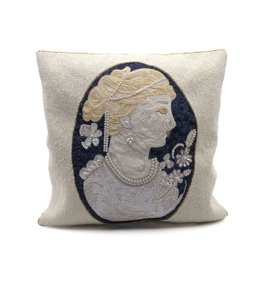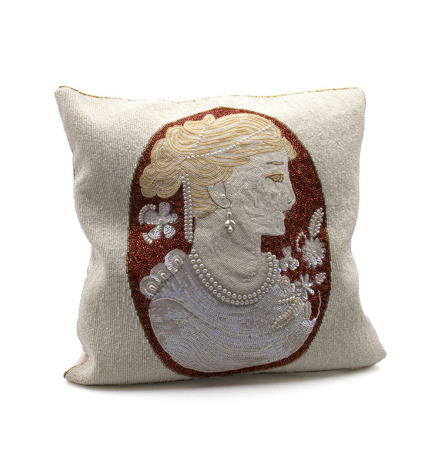 A classical portrait, reimagined in shimmering beadwork. This cameo-inspired pillow cover brings Italian elegance into your home—an AMEDEO signature designed for collectors of beauty and craftsmanship. Cover only, insert not included.