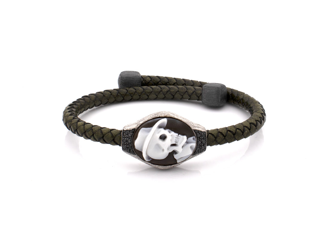 This captivating bracelet is a bold fusion of rugged and refined design, perfect for the modern individual who values both style and substance. The centerpiece of this bracelet is a meticulously carved cameo skull, set against a dark backdrop that emphasizes the intricate detailing of the piece. The skull, a symbol of mortality and timelessness, gives this bracelet an edge of mystery and intrigue, making it an ideal accessory for those who embrace both traditional craftsmanship and contemporary style.