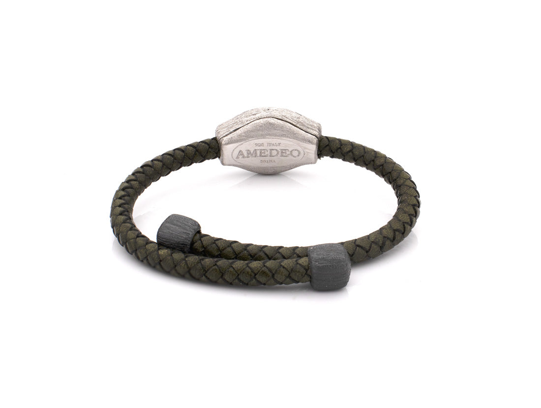 The bracelet features a braided leather band in a deep olive green, adding a masculine touch and enhancing its casual yet sophisticated vibe. The leather band is not only durable but also comfortable, making it a practical choice for everyday wear. The contrast between the organic texture of the braided leather and the polished look of the skull centerpiece creates a visually striking effect that is sure to turn heads.