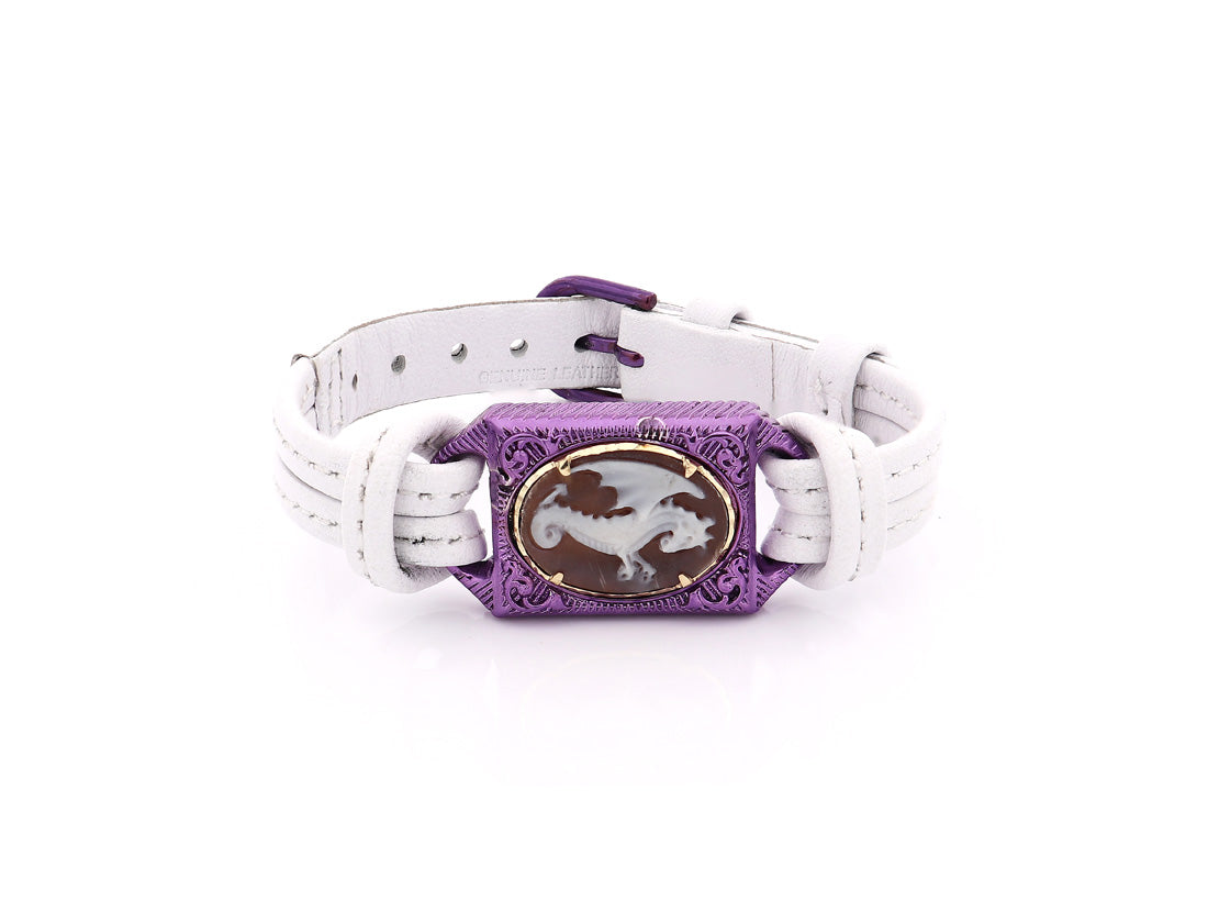 Introducing a unique and captivating creation, this bracelet features a majestic hand-carved cameo of a dragon, set against a backdrop of rich purple detailing. The meticulous craftsmanship of the dragon, a symbol of strength, power, and wisdom, is beautifully contrasted by the modern, sleek leather strap in white, adding a touch of contemporary elegance. Designed to be both bold and stylish, this piece is perfect for those who seek to make a statement with their accessories. The purple and white color combination enhances its versatility, allowing it to complement both casual and formal outfits. A true collector's item, this bracelet merges tradition and modernity, offering a timeless piece that reflects personality and taste
