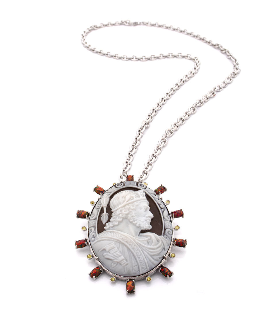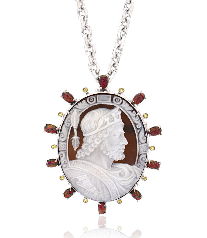 But it is the frame of this brooch-necklace that makes it truly extraordinary: a halo of fire opal cabochons, their fiery glow reminiscent of the emperor’s indomitable power, and delicate yellow sapphires, sparkling like stars, symbolizing wealth and enlightenment. The finely crafted silver setting encases the cameo with details that echo the splendor of ancient imperial jewelry.