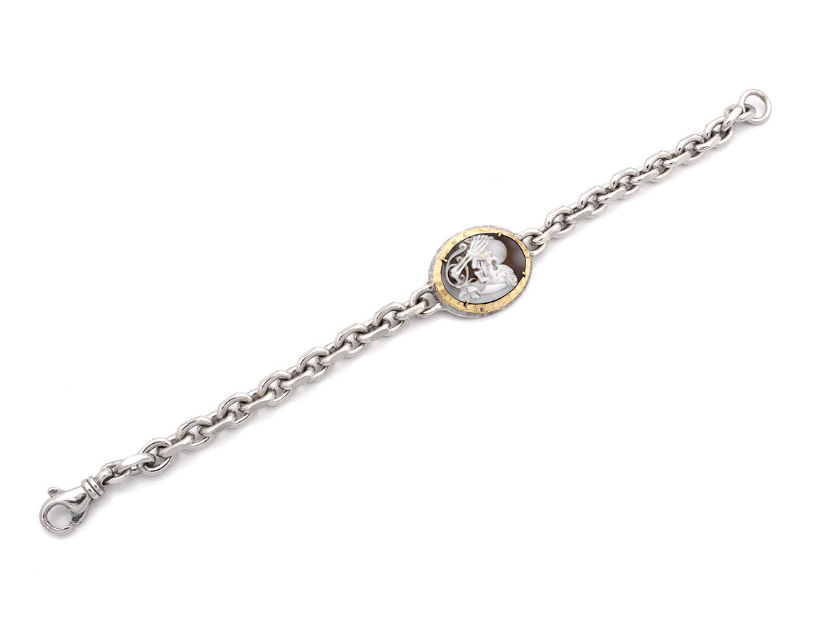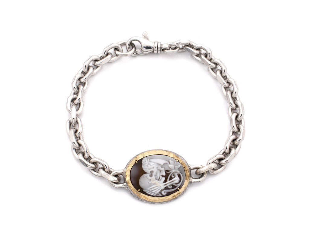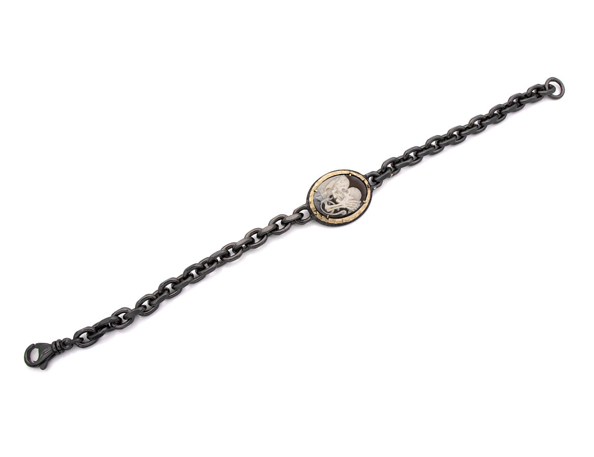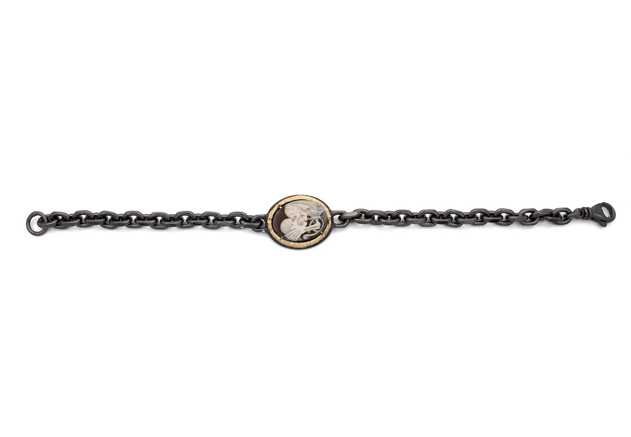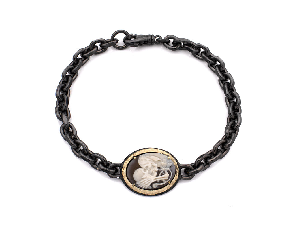 The gold-accented bezel frames the 20mm cameo with warmth and contrast, while the weighty chain links evoke strength, endurance, and timeless commitment. Whether worn as a personal statement or a symbolic gift, this bracelet is a tribute to love beyond death, romantic, resilient, and unforgettable.