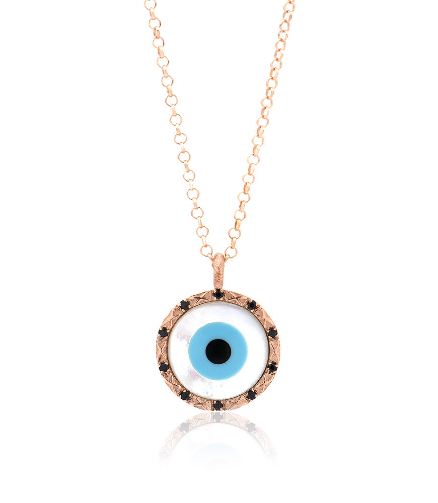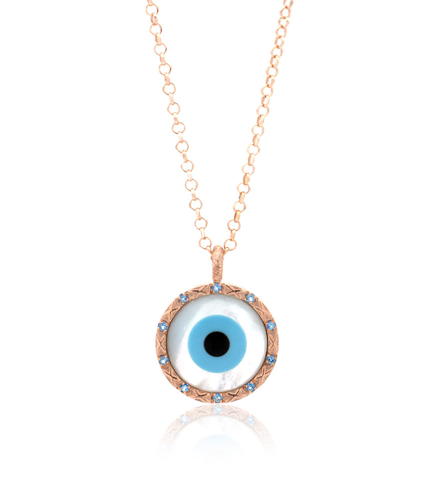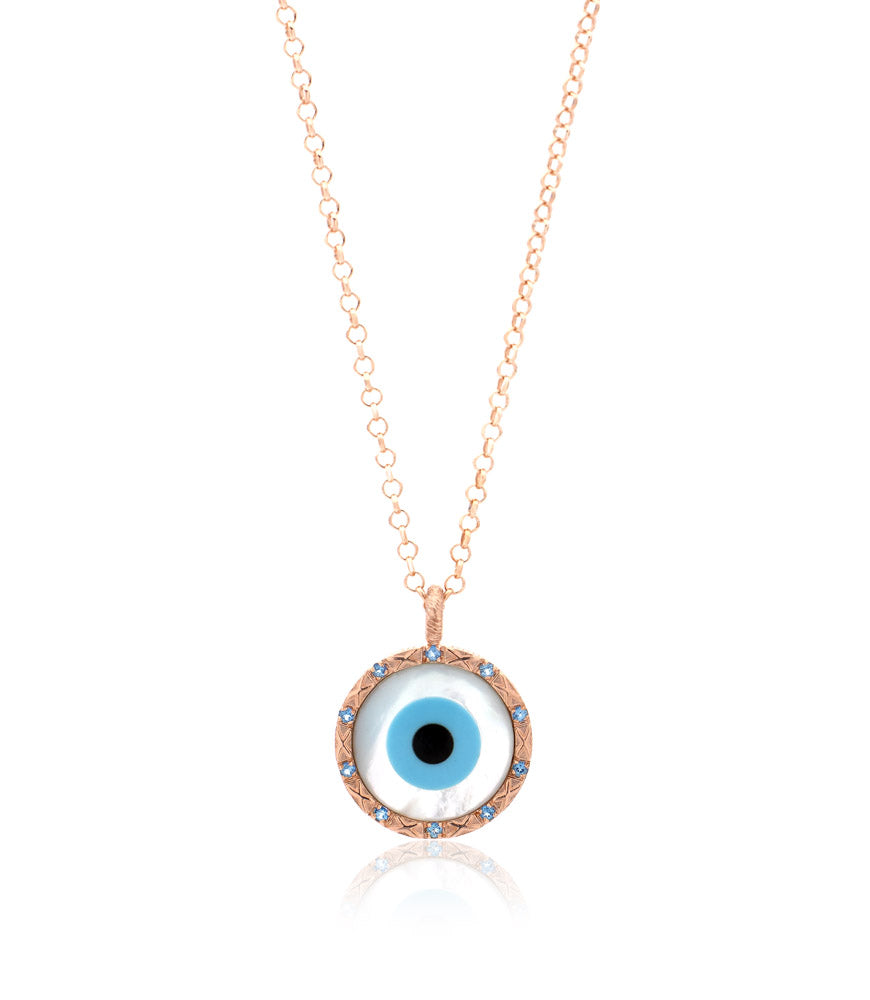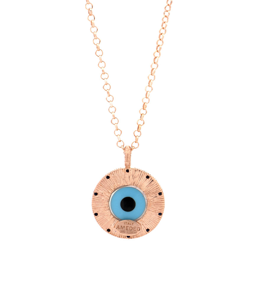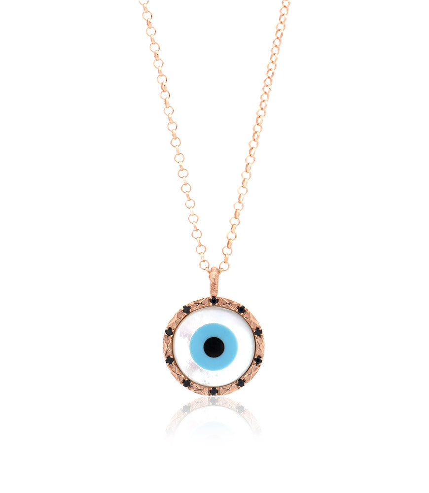 Let your style shine with a beautifully handcrafted Italian treasure. This stunning evil eye talisman is completed with sterling silver, mother of pearl, turquoise, and onyx.