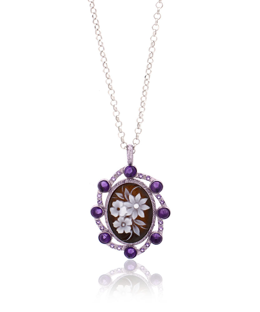 At its heart lies a delicately engraved floral cameo in natural shell, where each petal is sculpted with precision and grace. Encircling the composition, radiant amethysts enhance the design with their majestic violet hues — a symbol of royalty, spirituality, and refined elegance.