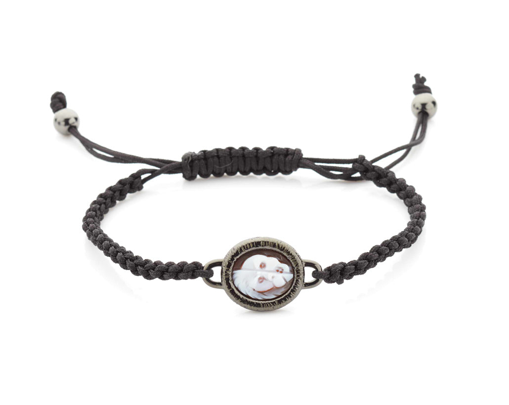 This hand-carved 12mm sardonyx shell cameo bracelet features a striking motif merging a lion and a skull, set in hematite-tone metal and finished with black cotton macrame. Bold and symbolic, it embodies strength, courage, and fearless individuality. Transforming classic imagery into a statement of power and refined craftsmanship, this bracelet is more than jewelry—it is an emblem of character, edge, and timeless style.