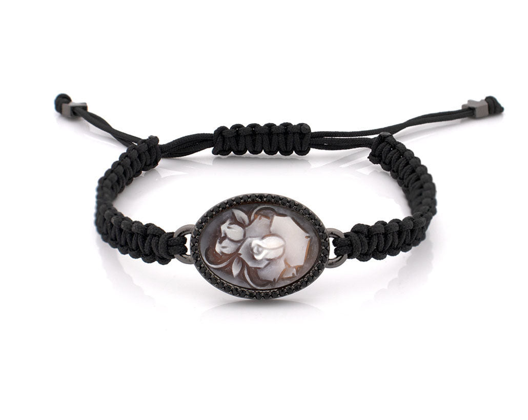 Hidden Bloom is a bracelet centered on a hand-carved sardonyx cameo depicting a flower emerging softly from shadow.