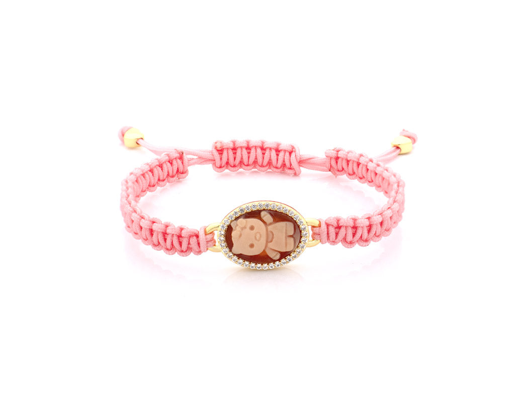 Children’s bracelet with a hand-carved cameo inspired by Hello Kitty, featuring a sweet kitten with her iconic bow. Set on a pink adjustable cord and framed with sparkling white crystals, it’s the perfect gift for little ones who love cats, color, and fun accessories.