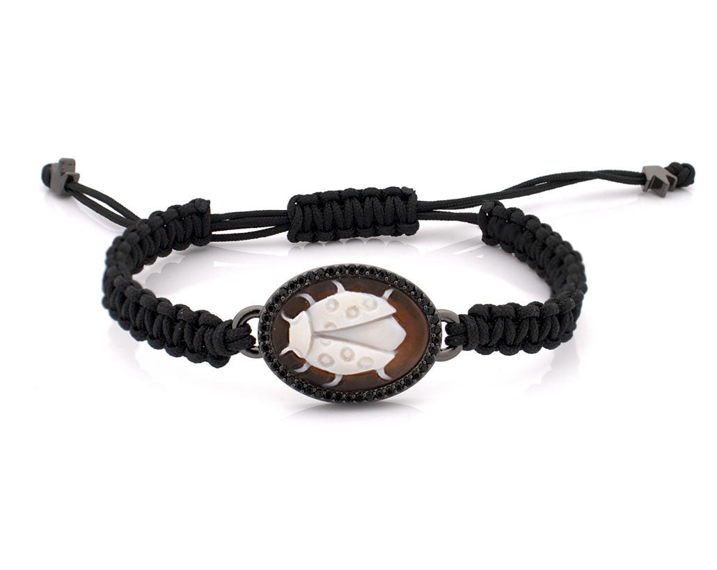 This black macramé bracelet is embellished with a hand-engraved cameo, depicting a ladybug, a symbol of luck and protection. The black stone frame detail adds a touch of modern luxury, making it perfect for those who love refined and meaningful style.