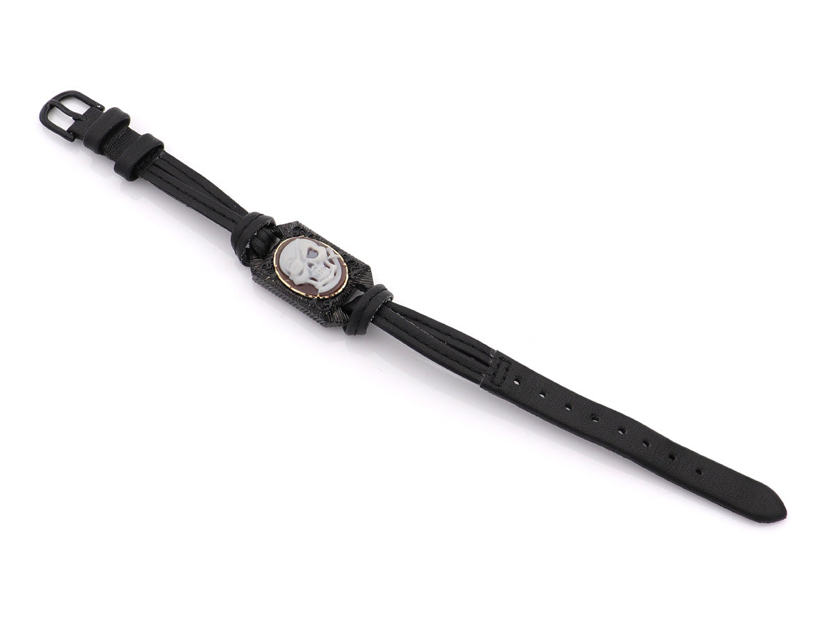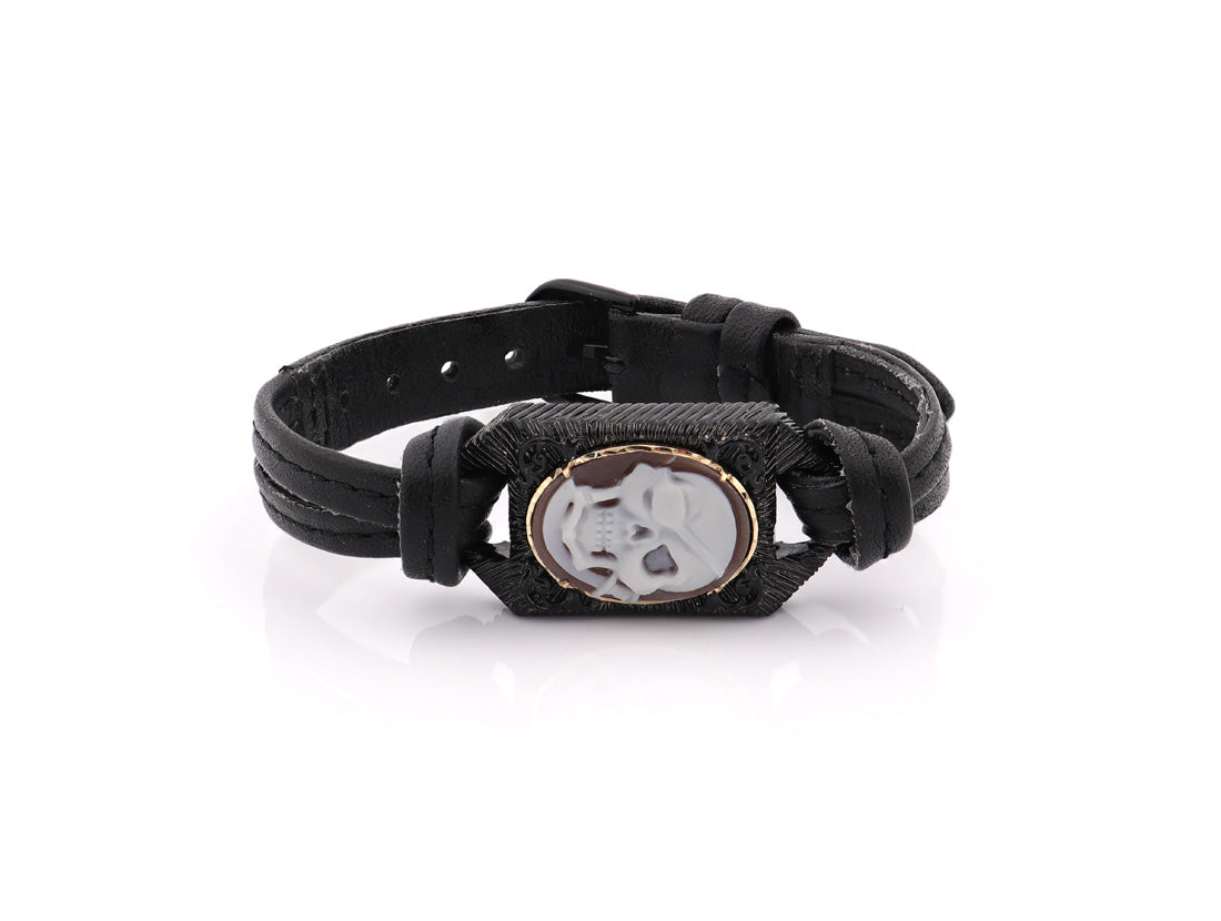 Titled “MEMENTO MORI”, this hand-carved 18mm sardonyx shell cameo features a pirate skull, set in 18kt gold and sterling silver, and finished with a black leather band. The piece embodies the essence of MEMENTO MORI—a reminder of life’s impermanence and the bold embrace of mortality. Combining refined craftsmanship with rebellious spirit, it is more than jewelry—it is a statement of fearless individuality, adventure, and timeless style.