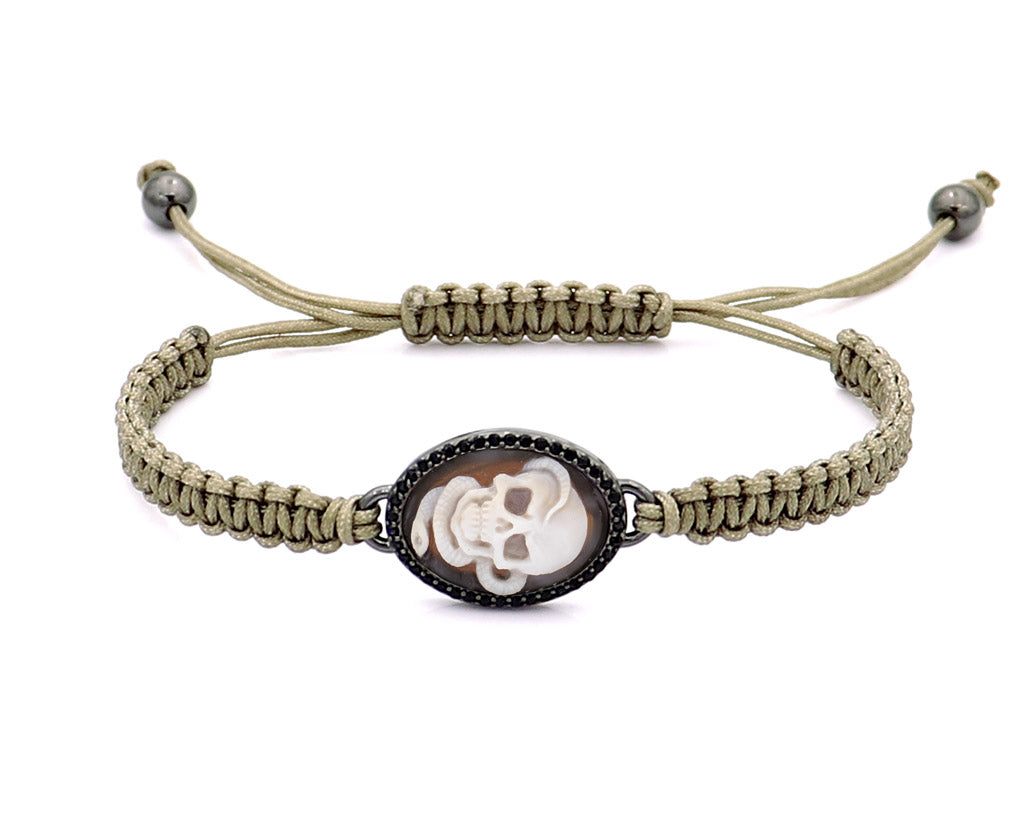 This hand-carved 18mm sardonyx shell cameo features a skull entwined with serpents, set in a hematite-tone metal and accented with black crystals. MEMENTO MORI, meaning “remember that you must die,” serves as a powerful reminder of life’s impermanence, embracing mortality with bold elegance. Striking and symbolic, this ring transforms a classic emblem of mortality into a statement of resilience, individuality, and fearless style.