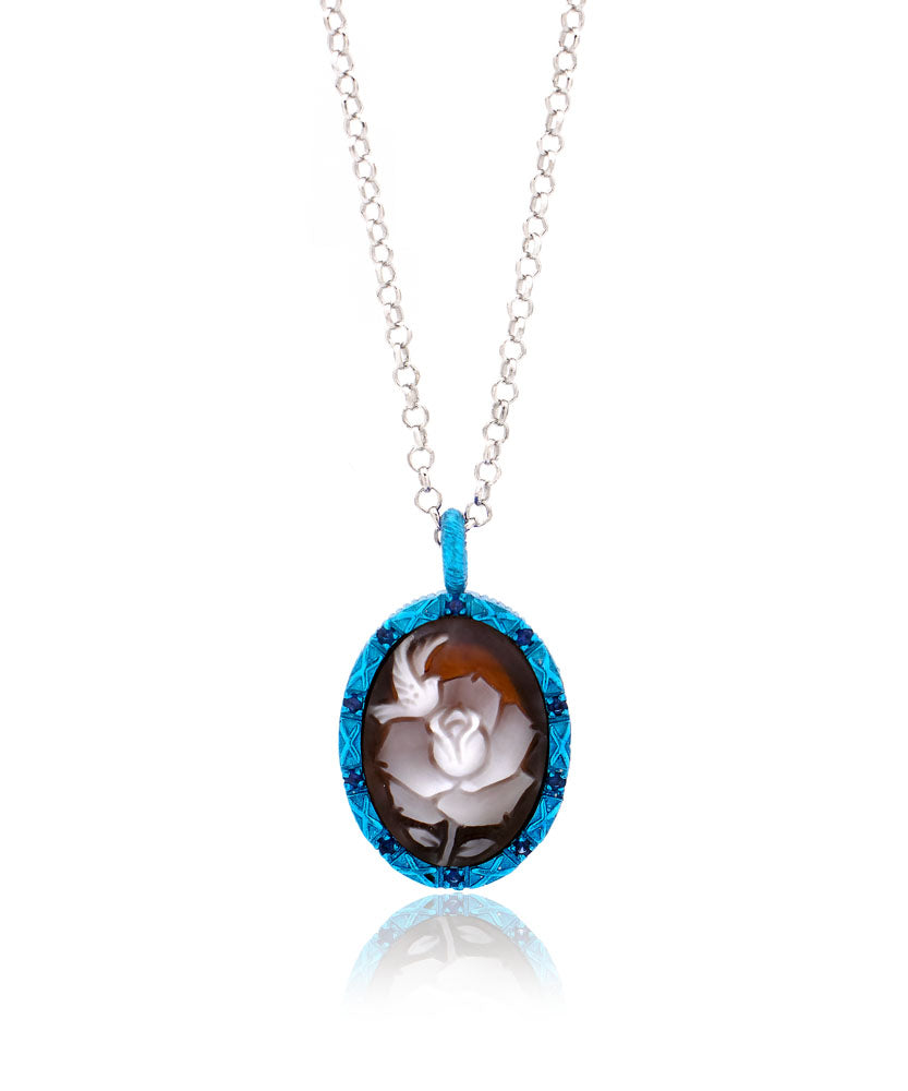 The setting is adorned with blue sapphires, gemstones long associated with purity, clarity and regal sophistication. Their deep celestial tones illuminate the carving, enhancing the necklace with a refined, couture radiance.