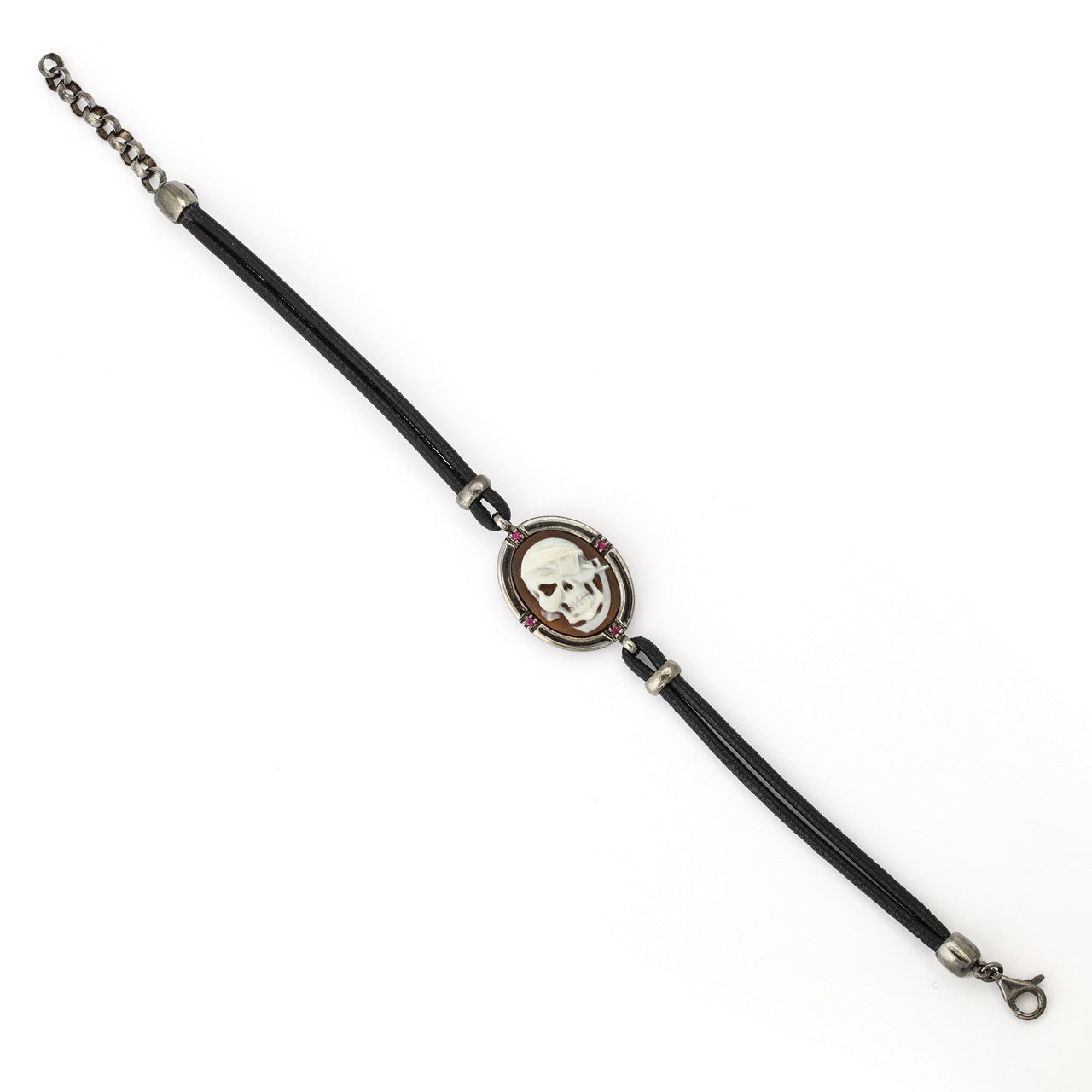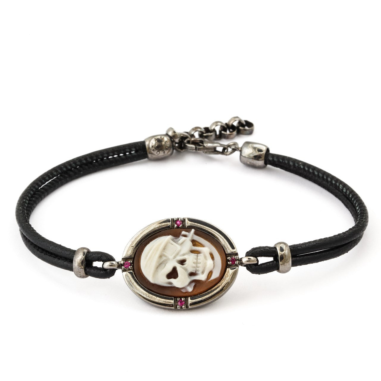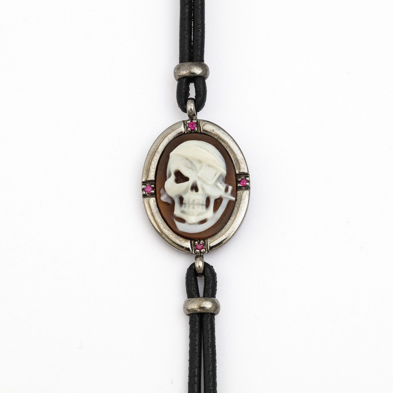Titled “PIRATA”, this hand-carved 20mm sardonyx shell cameo bracelet features a striking skull motif, set in sterling silver with black rhodium and accented with rubies. The piece balances bold craftsmanship with refined elegance, transforming a symbol of mortality into a statement of individuality and adventurous style. Sleek and impactful, it is more than jewelry—it is a celebration of daring, character, and timeless sophistication.