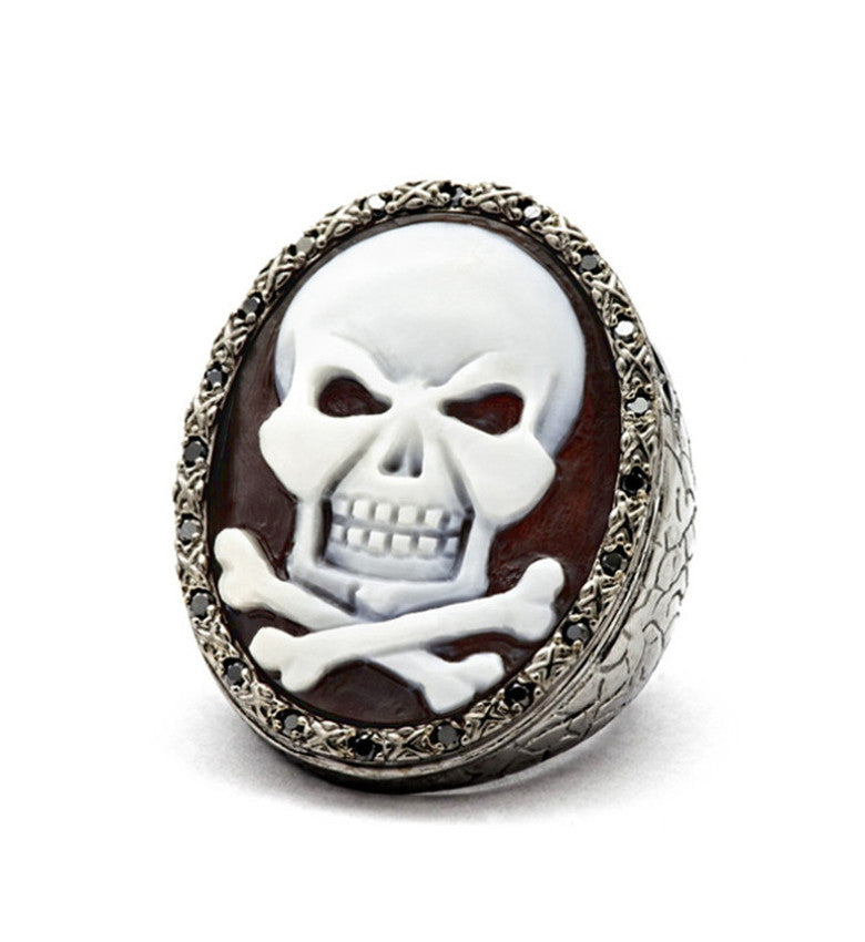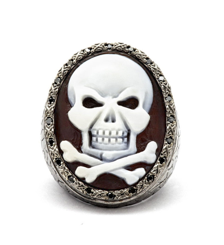 Titled “The Pirate’s Oath”, this hand-carved 30mm sardonyx shell cameo features a skull with crossed bones—a classic emblem of pirate lore and fearless adventure. Set in sterling silver with black rhodium and accented with black diamonds, the piece embodies the daring spirit of the pirate’s code: loyalty, courage, and living life on one’s own terms. The skull-and-crossbones motif transforms the ring into more than jewelry; it is a symbol, a statement of bold individuality and unyielding resolve. Wear it as a tribute to adventure, rebellion, and the oath that guides those who embrace the unknown.