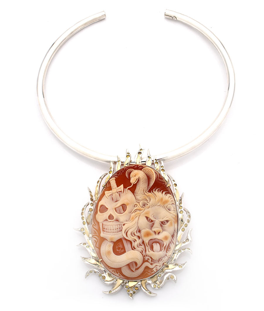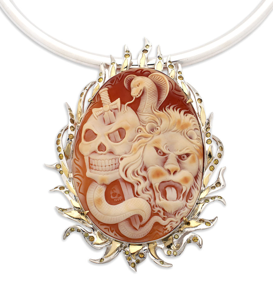 A hand-carved masterpiece depicting the eternal conflict between light and darkness. In this extraordinary cornelian shell cameo, symbols of life, death, and rebirth intertwine in a dramatic and powerful composition. Every sculpted detail reflects the mastery of Torre del Greco artisans, transforming the ancient art of cameo carving into a timeless narrative.