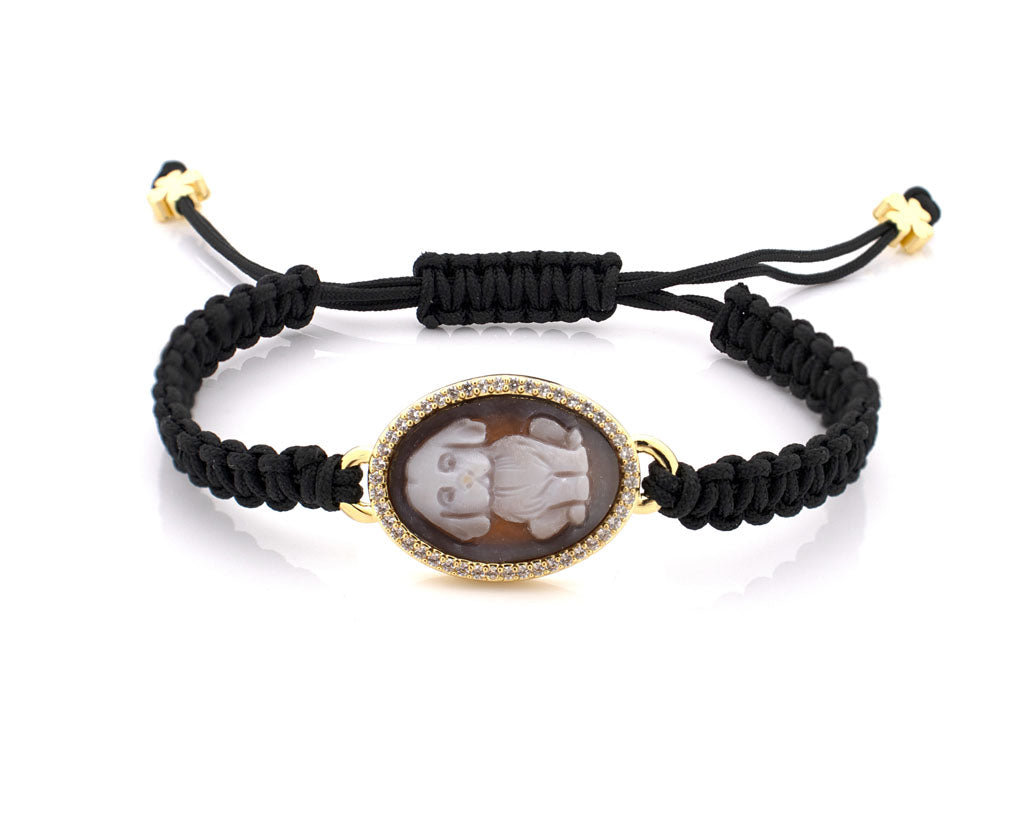 The Little Baron is an AMEDEO bracelet centered on a hand-carved sardonyx cameo depicting a noble dog portrait, rich in character and quiet authority. Framed by a halo of sparkling crystals and set on an adjustable cord, it blends classical Italian cameo artistry with modern elegance. A refined statement piece—witty, regal, and unmistakably collectible.