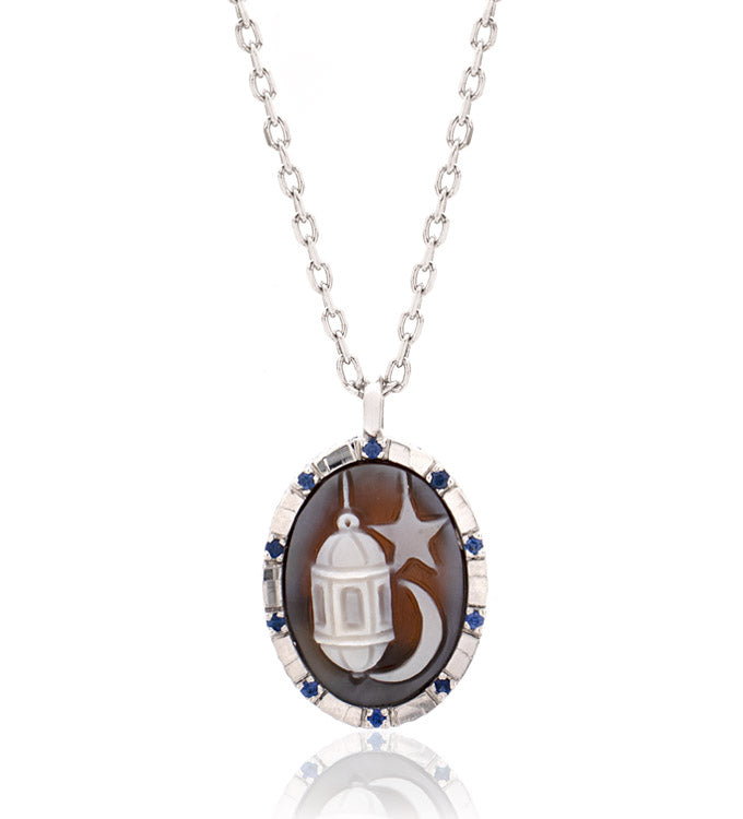This exquisite cameo honors the sacred essence of Ramadan with a finely carved sardonyx shell, depicting the crescent moon, star, and two lanterns—symbols of light and spirituality. Crafted with masterful artistry, it is set in a sterling silver frame adorned with pink sapphires, enhancing its elegance and mystical charm. More than just an accessory, this jewel is a symbol of faith and tradition, perfect for accompanying you in the most meaningful moments of your spiritual journey.