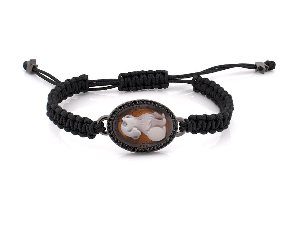 The Watcher is a bracelet centered on a hand-carved sardonyx cameo depicting a dog in quiet vigilance. The cameo is framed by black crystals and set on an adjustable black cord, creating a stark contrast between classical carving and modern restraint.
