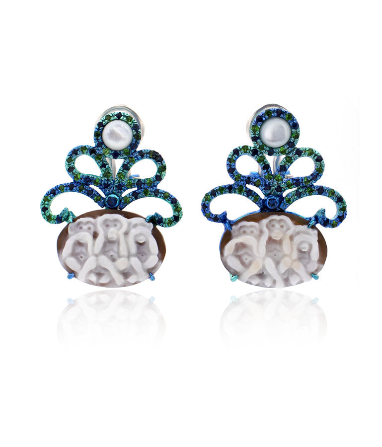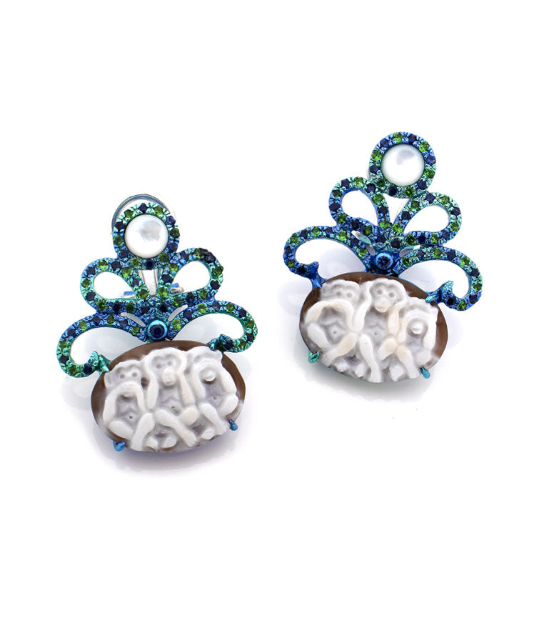 Trinity of Silence is a jewel rich in meaning and quiet power. Hand-carved in natural shell following the centuries-old tradition of Torre del Greco, the cameos depict the iconic three monkeys — a universal symbol of wisdom, restraint and mindful silence. Both playful and profound, this subject is reimagined through AMEDEO’s distinctive couture lens.