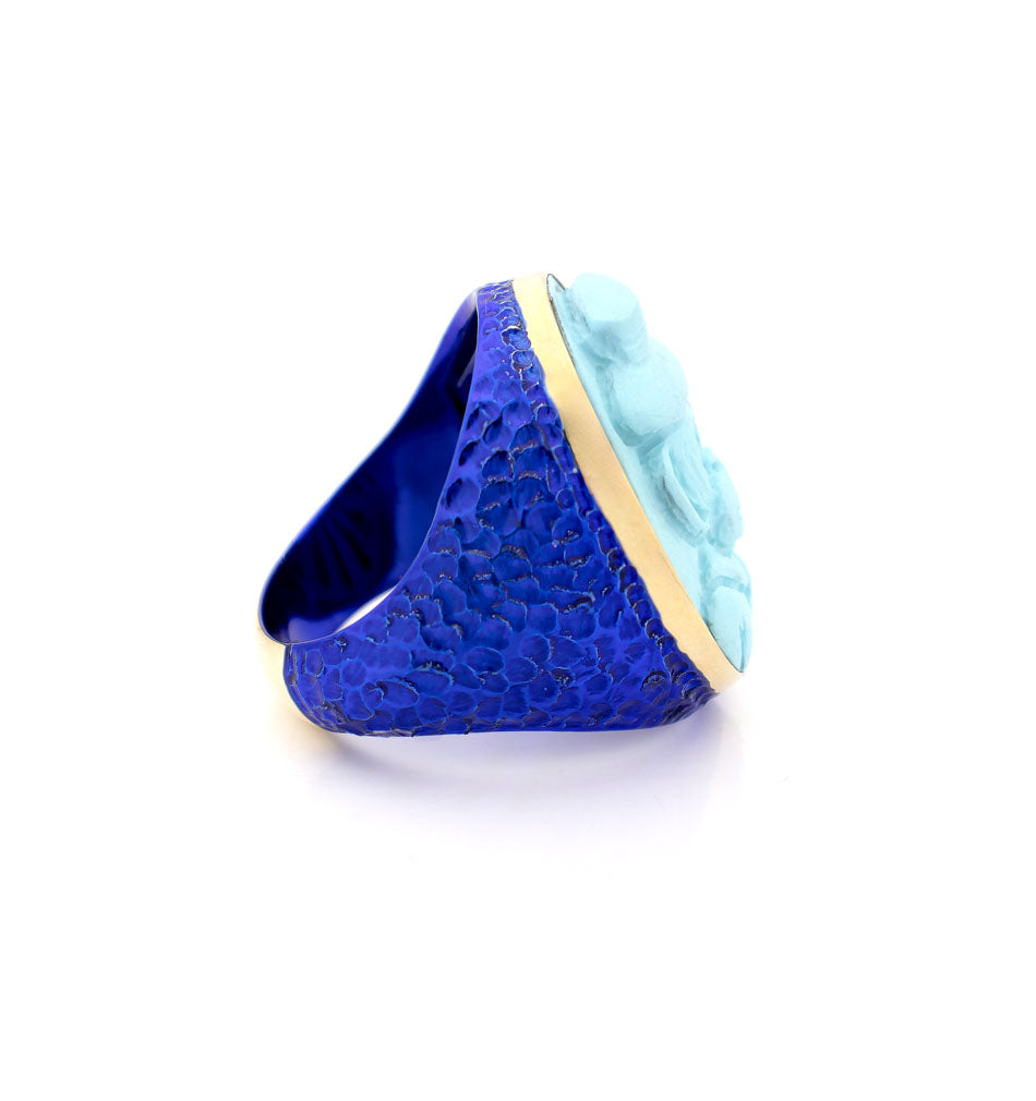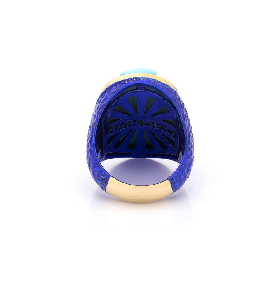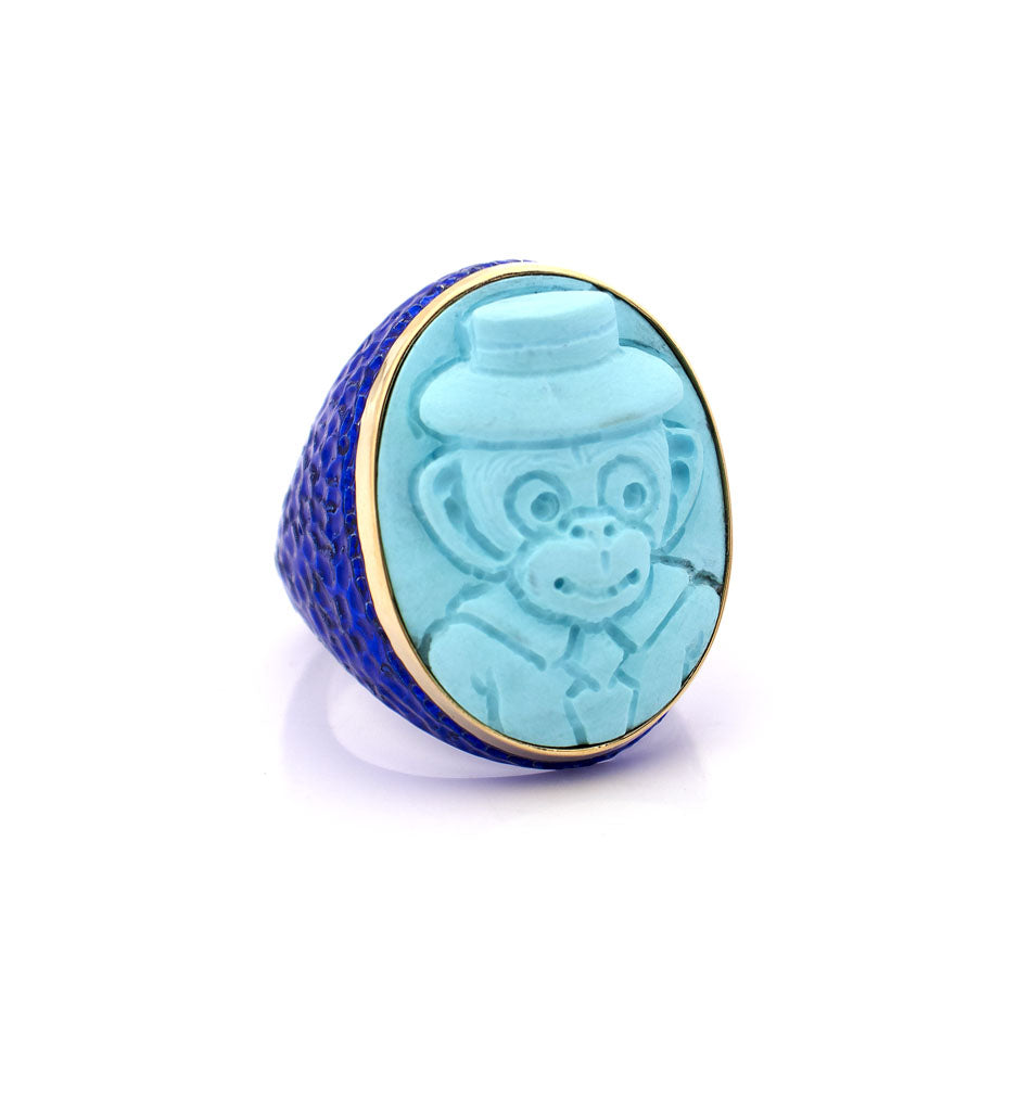 Turquoise Dandy is a tribute to style, character and refined irony — a signature of AMEDEO’s contemporary approach to cameo artistry. The ring features a hand-carved turquoise–paste cameo depicting a charming dandy monkey figure wearing a hat, blending humour with couture sophistication.