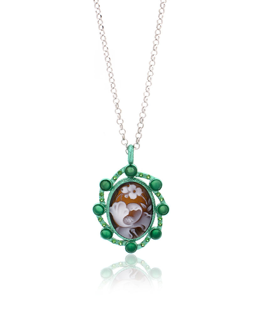 Its rich emerald tones evoke renewal, prosperity and noble strength, conjuring the image of a modern empress adorned in the splendour of nature. Every detail reflects Italian craftsmanship excellence and AMEDEO’s philosophy: elevating the cameo into a symbol of contemporary royalty and timeless refinement.